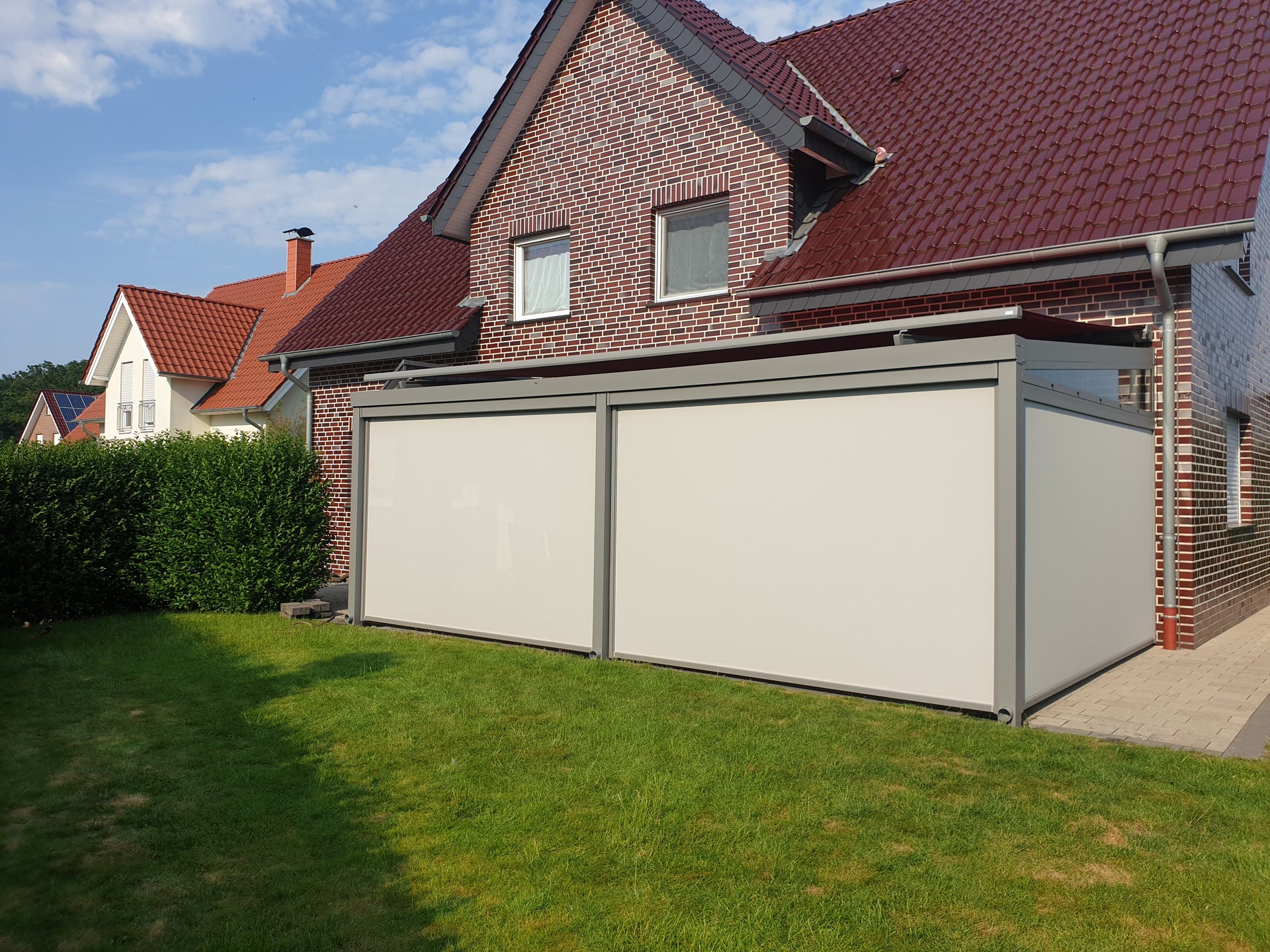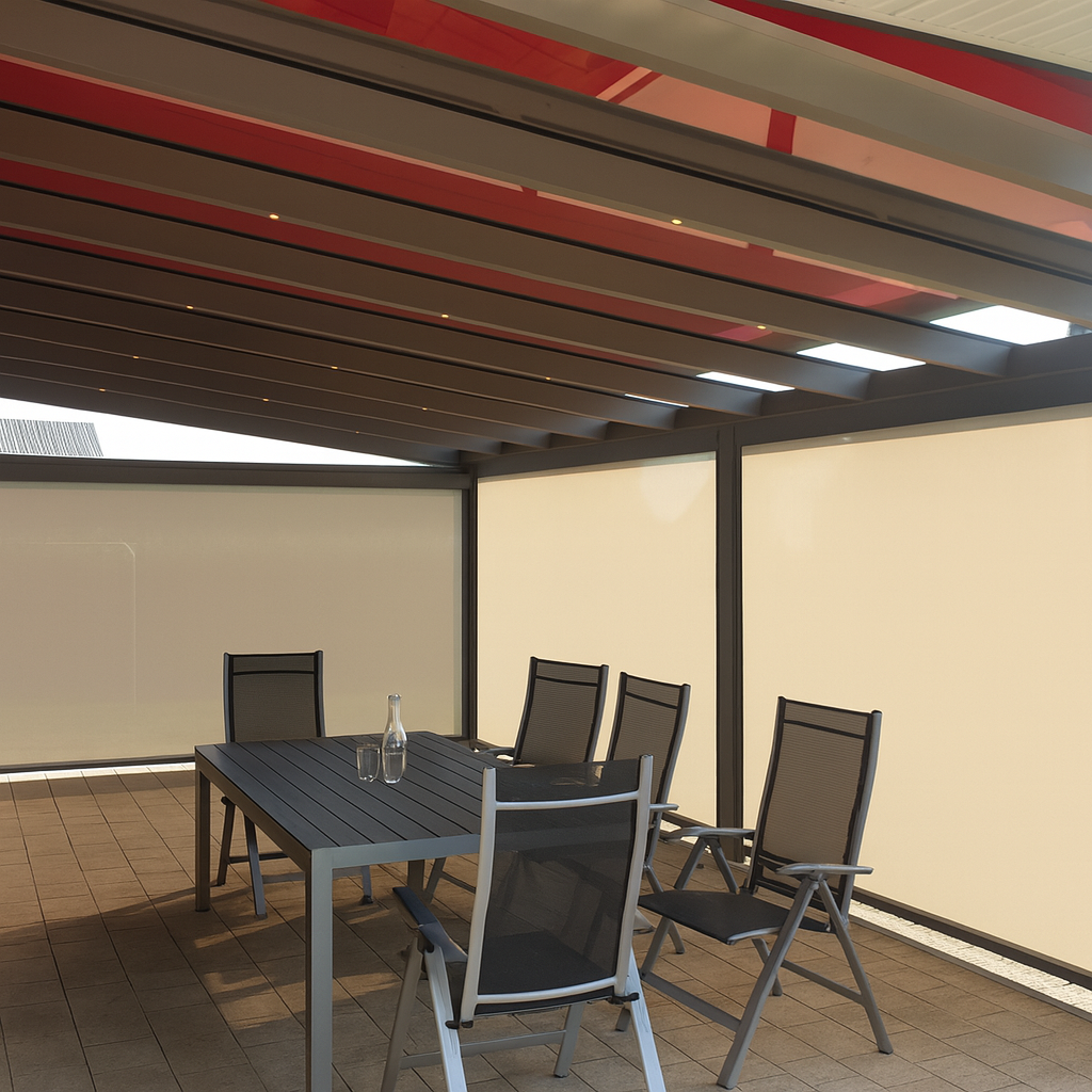 Seitlicher Sonnen-, Sicht- und Windschutz. Stufenlos steuerbar und in verschiedenen Stoffen und Farben erhältlich – für Privatsphäre und angenehmes Klima.